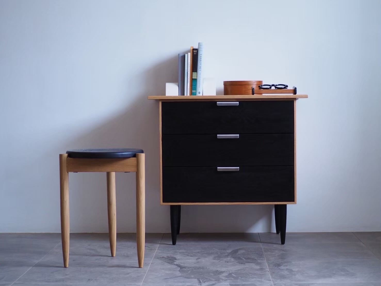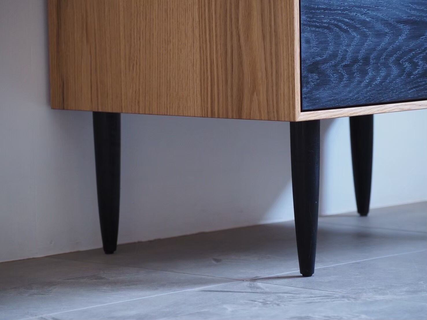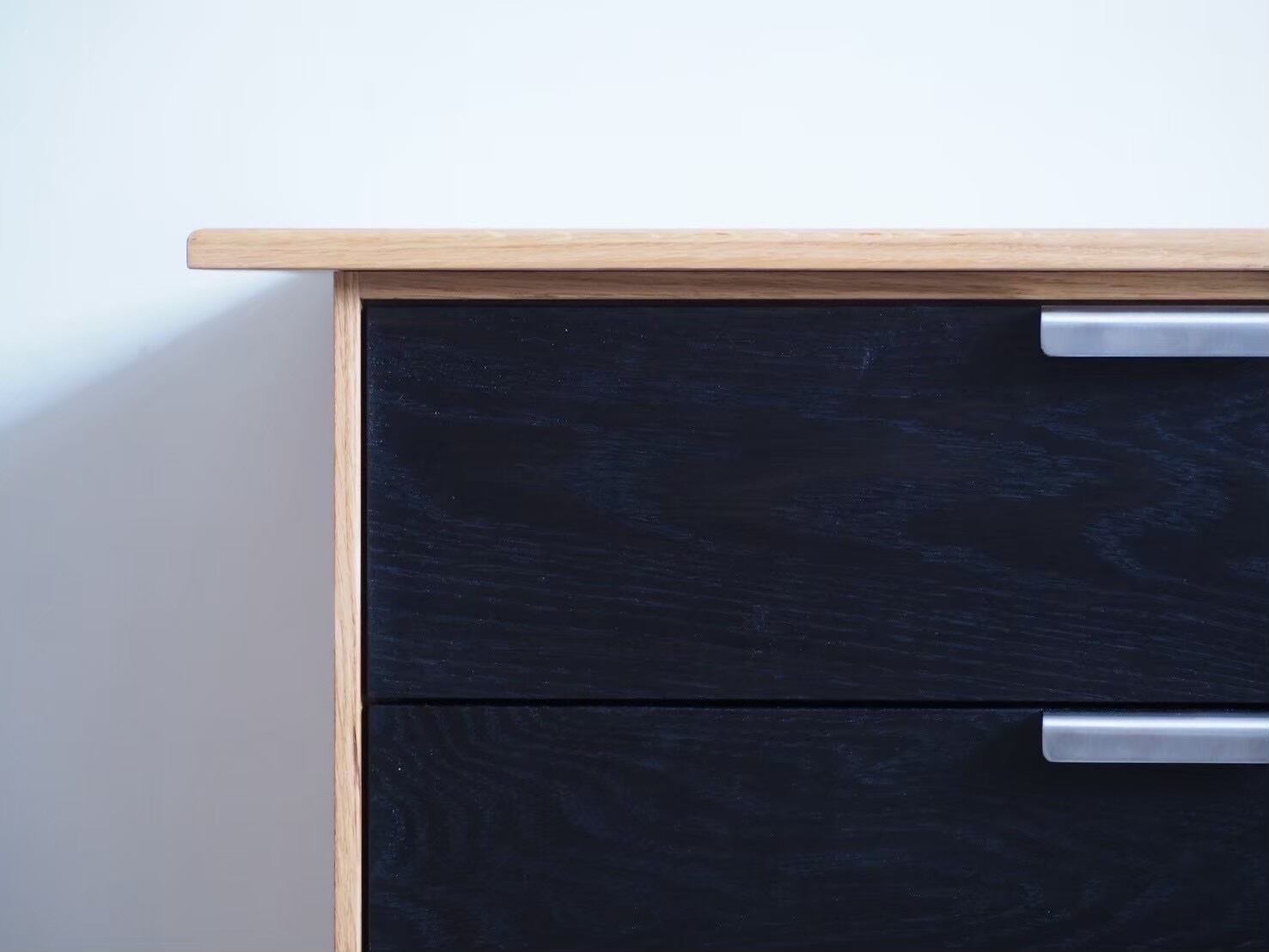 今回は引き出しの面材と脚を黒の鉄媒染仕様にしていますが、箱と同色、又は引き出し面材のみ違う素材に変更しても良いかと思います。