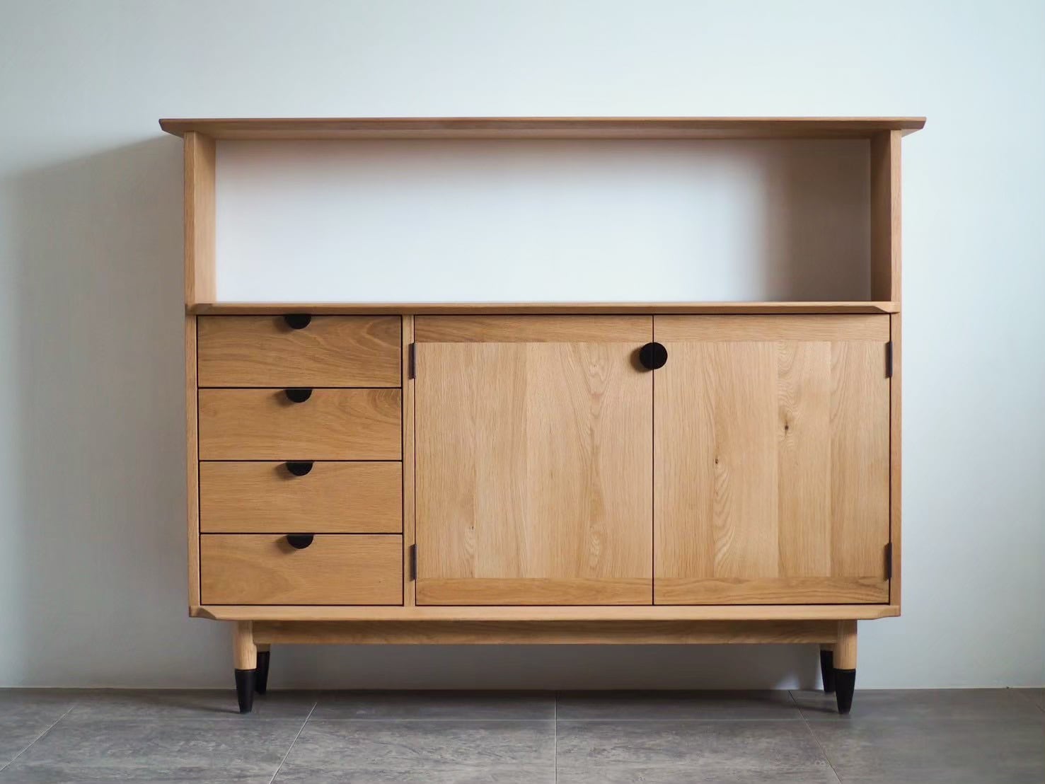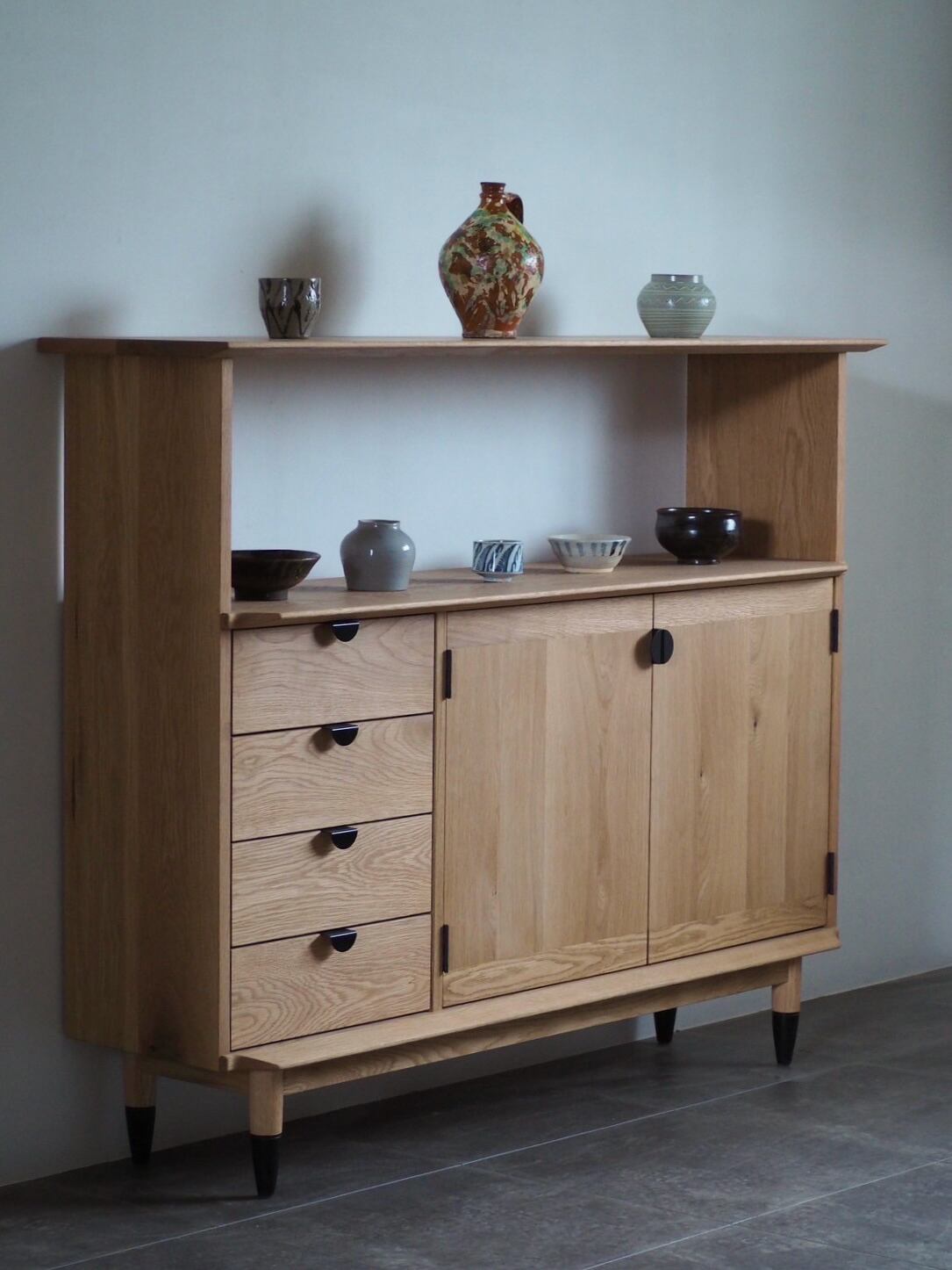 民藝の飾り棚のフォルムを踏襲しながら、自分が影響を受けてきたミッドセンチュリーを掛け合わせる。