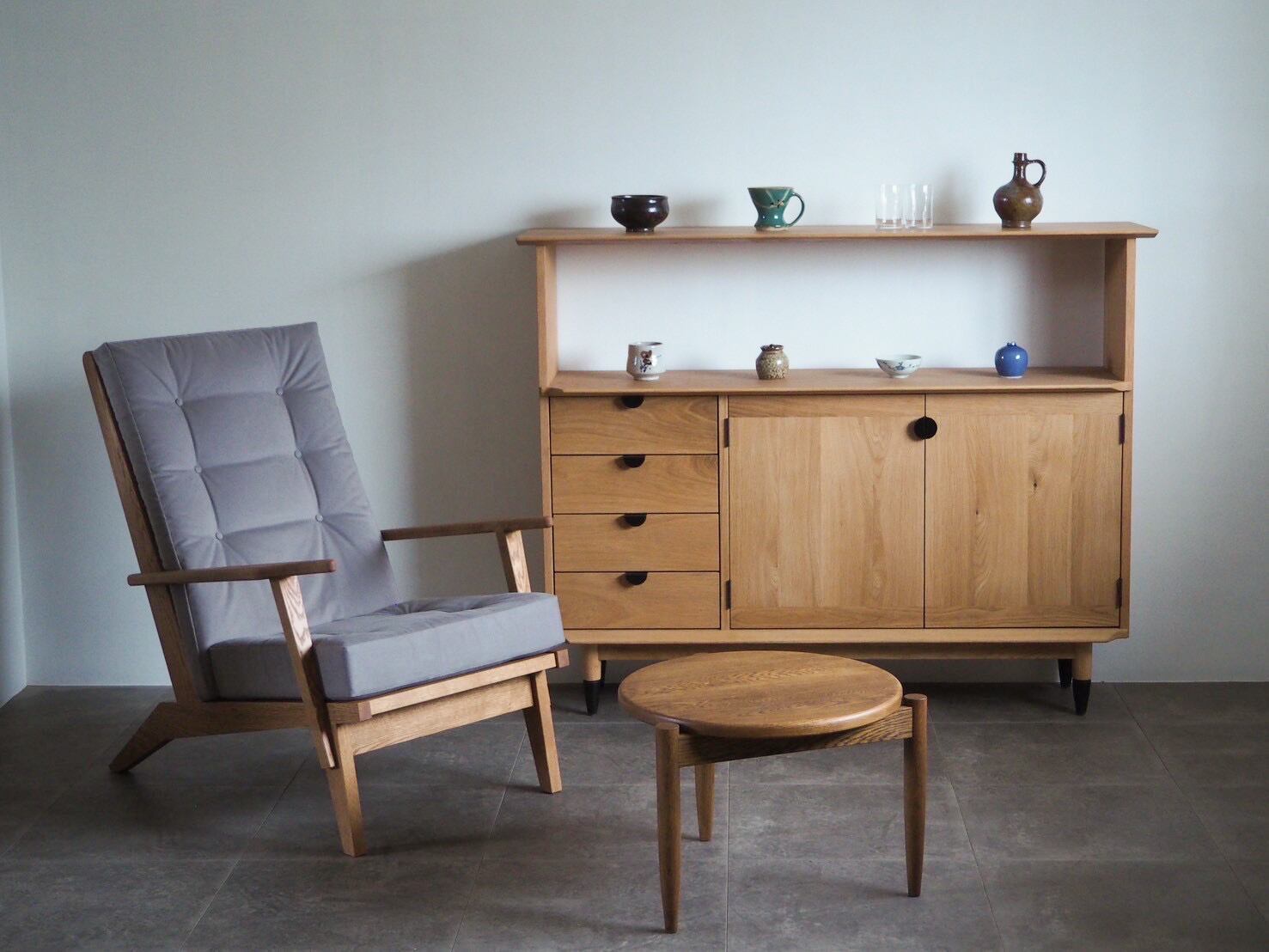 先人が作った器を、先人の家具から影響を受けて現代の家具を飾りたい。